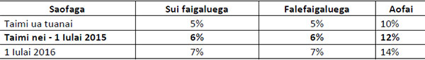 Talu ai o nei suiga ua amata faamamaluina ile aso 01 Iulai 2015, o lea matou te toe faamanatu atu ai i Fale- Faigaluega uma ia utagia mai lenei si’itaga o saofaga i le 6% ina ia aofia ai i Tusi Saofaga mo le masina o Iulai 2015, ma faaauau ai pea i masina o mulimuli mai.